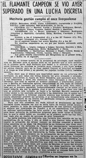 En el arranque del Campeonato Uruguayo nos toca con el campeón e invicto Central, en Belvedere. Jugamos con Bores, Ackerman y Holdoway, Rodríguez, Sixto de capitán que vuelve al equipo y Moraña, el argentino recién incorporado Cavadini, Eirín, el “Toro” Benítez, Carrasale y el argentino Lombardini. Arrancamos ganando a los 9 minutos con gol de Lombardini, pero nos empata Vomero. En el segundo tiempo el “Toro” Benítez pone el segundo y Liverpool arranca el campeonato dando la sorpresa: el último del Competencia vence al campeón y le corta su invicto. En la segunda fecha caemos bien con Nacional 4 a 1, luego con Miramar 2 a 1 y vencemos a Sud América 3 a 1 con doblete del argentino Lombardini. Perdemos 2 a 1 con Defensor, 4 a 2 con Peñarol y 2 a 1 con River. Terminamos empatando con Racing 1 a 1 y cayendo 3 a 0 con el invicto Wanderers, la sorpresa de esa primera rueda.