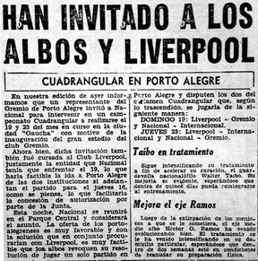 El 20 de setiembre, al otro día de la inauguración, es el debut del Glorioso Liverpool en tierras brasileñas. Con el arbitraje del Sr Tonelli y ante gran presencia de público, Liverpool saltó al nuevo estadio del Gremio aquel día con Hugo Silvera; Roberto Fleitas y José Traverso; Julio Villarreal, Osiris Romero y Arismendi; Olivera, Erely Pérez, Manuel Abreu, Guillermo Pedra y Orlandi. El Internacional de Porto Alegre, jugó con Milton; Florindo y Lindoberto; Oreco, Salvador y Odorico; Luizinho, Bodinho, Larri, Jerónimo y Canotinho.