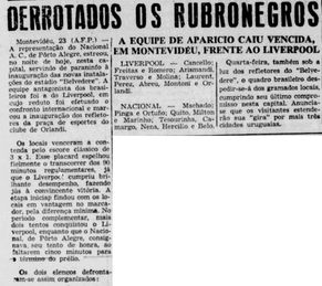 Nacional de Porto Alegre se va arriba y Liverpool se salva dos veces, una gracias a Canchelo y otra porque el delantero Ercilio le erra al arco cuando estaba solo para convertir. Tesourinha, el veterano crack del equipo, realiza gran jugada sobre los 28 minutos. Se escapa de Romero y levanta un centro medio que increíblemente ninguno de sus compañeros logra conectar. Nacional empardó el trámite del partido pero no pudo empardar el tanteador, que termina 1 a 0 a favor de Liverpool ese primer tiempo.