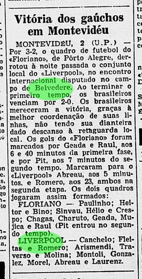 El Floriano tenia una camiseta semejande a la del Flamengo, y dado que el partido era nocturno, no se diferenciaban bien las camisetas. Esto hace que Liverpool entre para el segundo tiempo con camiseta blanca. Iban solamente 4 minutos del complemento cuando ante un tiro de Chagas que va al arco Canchelo no puede contener y rechaza a medias. Le queda la pelota a Geada, que pone el empate. Sin embargo Liverpool reacciona rápidamente y a los 7 minutos está en ventaja de nuevo por intermedio de Erley Pérez. Sobre los 22 minutos nos pusimos 4 a 2 cuando tras una corrida Laurens levanta un centro que Morel toma de sobre pique y convierte. Lejos de liquidarse, a los 26 Floriano se pone 4 a 3 cuando tras un error de Lapaitis, que despeja a medias y molesta a Canchelo, Mujica pone el descuento y al Floriano en partido otra vez. Según la prensa hubo un claro penal cometido por Roberto Fleitas que el juez no cobró. El partido terminó con victoria negriazul 4 a 3.